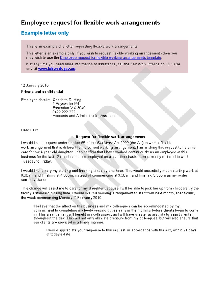 Dear </strong> request for flexible working arrangements i would like to request under section 65 of the fair.</p> While all employees can ask for flexibility at work, certain employees have a legal. To request to work remotely from the home or any other working place.